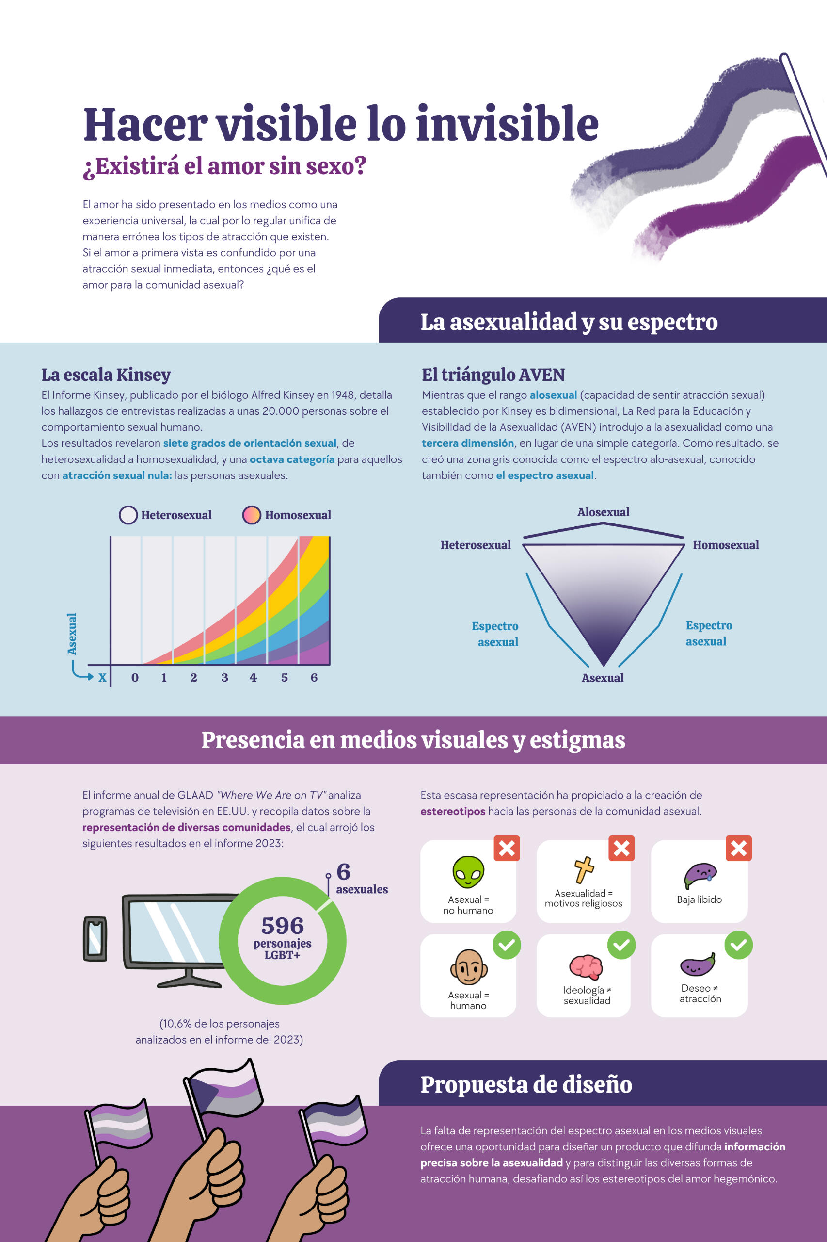 La falta de representación del espectro asexual en los medios visuales ofrece una oportunidad para diseñar un producto que difunda información precisa sobre la asexualidad y para distinguir las diversas formas de atracción humana, desafiando así los estereotipos del amor hegemónico.