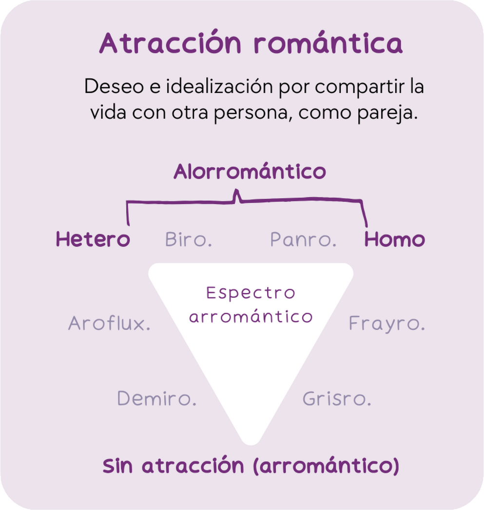 De manera similar, la atracción romántica se define como el deseo e idealización por compartir o fusionar la vida con otra persona, como pareja; puede ir desde la atracción a personas del mismo género (homorromántico) hasta la atracción por personas del género opuesto (heterorromántico), pero también puede existir una atracción nula; las personas que no sienten atracción romántica por nadie son denominadas arrománticas.El espectro arromántico contempla a aquellas personas que son alorrománticas (personas que presentan atracción romántica) hasta las personas arrománticas, dando como resultado un espectro en donde la atracción romántica fluctúa.