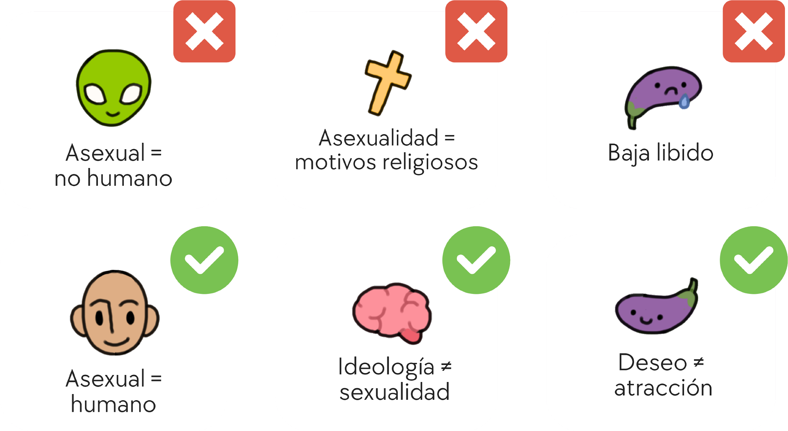 Suele ser representada en personajes no humanos, se compara con el celibato y también suele ser confundido con el bajo deseo sexual, cuando, en realidad, la asexualidad es completamente humana, es ajena a la ideología y también ajena a la libido.