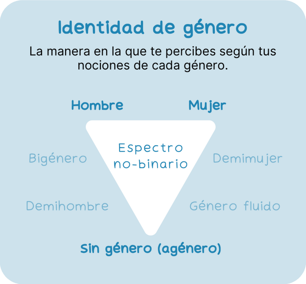 La identidad de género es la manera en la que cada individuo se percibe: el cómo viven y sienten su cuerpo, de manera personal. Es por ello que este espectro es tan amplio, ya que no se limita al binarismo hombre y mujer, sino que también incluye a todo lo no-binario: lo que existe entre ser hombre y mujer, y también, lo que existe fuera de ese rango.