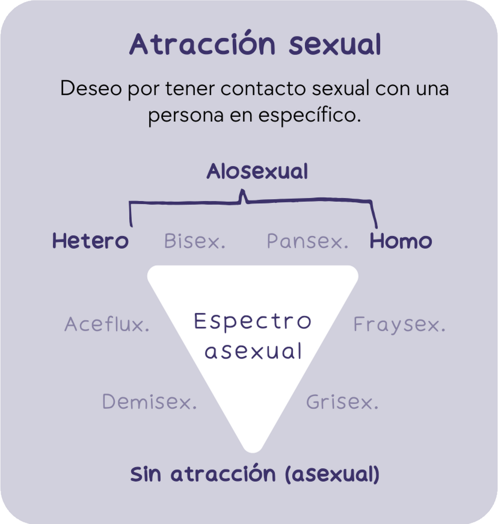 La atracción sexual se define como el deseo por tener contacto sexual con una persona en específico, y puede ir desde la atracción a personas del mismo género (homosexualidad) hasta la atracción por personas del género opuesto (heterosexualidad), pero también puede existir una atracción nula; las personas que no sienten atracción sexual por nadie son denominadas asexuales.El espectro asexual contempla a aquellas personas que van desde la alosexualidad (personas que presentan atracción sexual) hasta las personas asexuales, dando como resultado un espectro en donde la atracción sexual fluctúa.